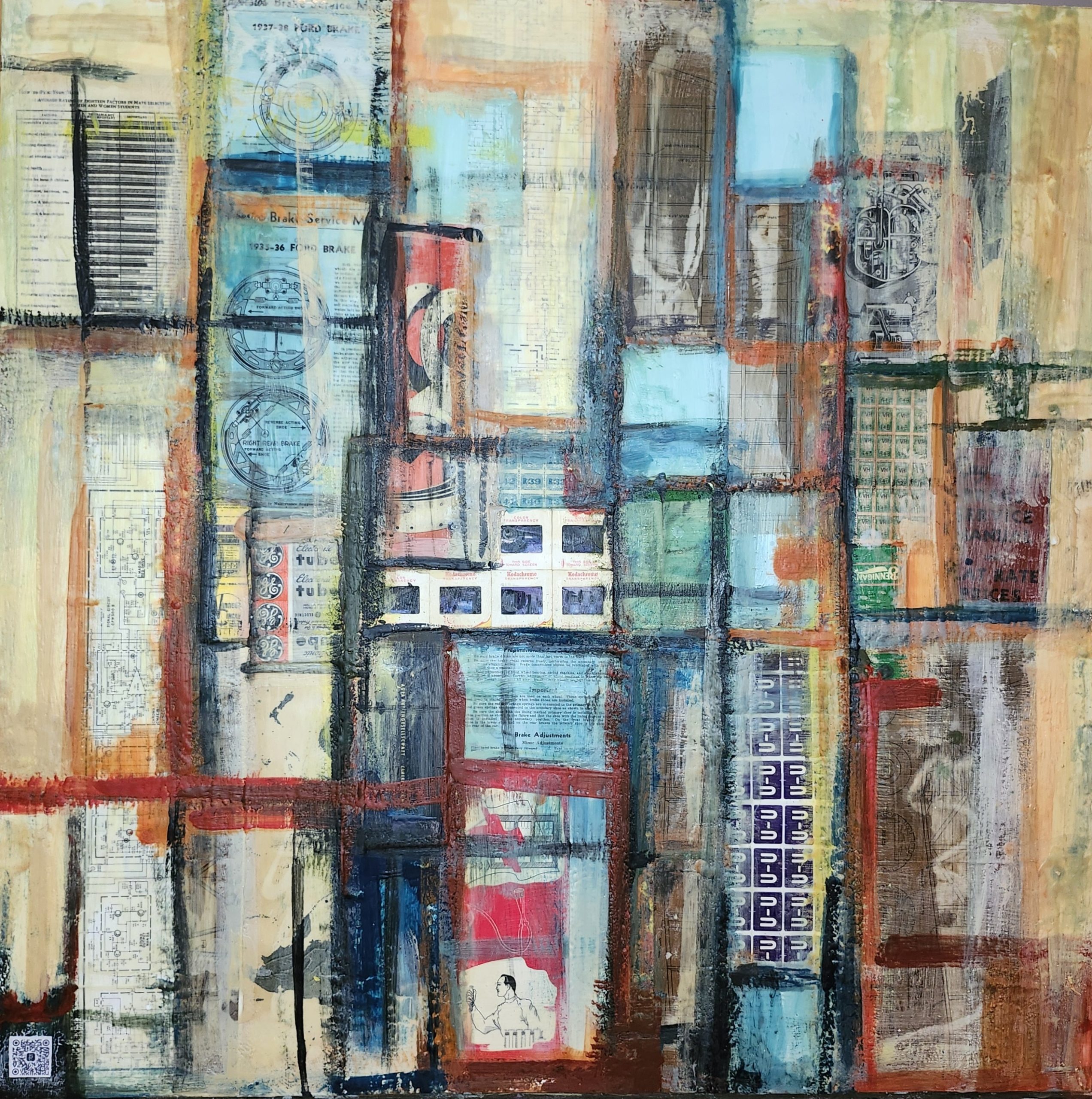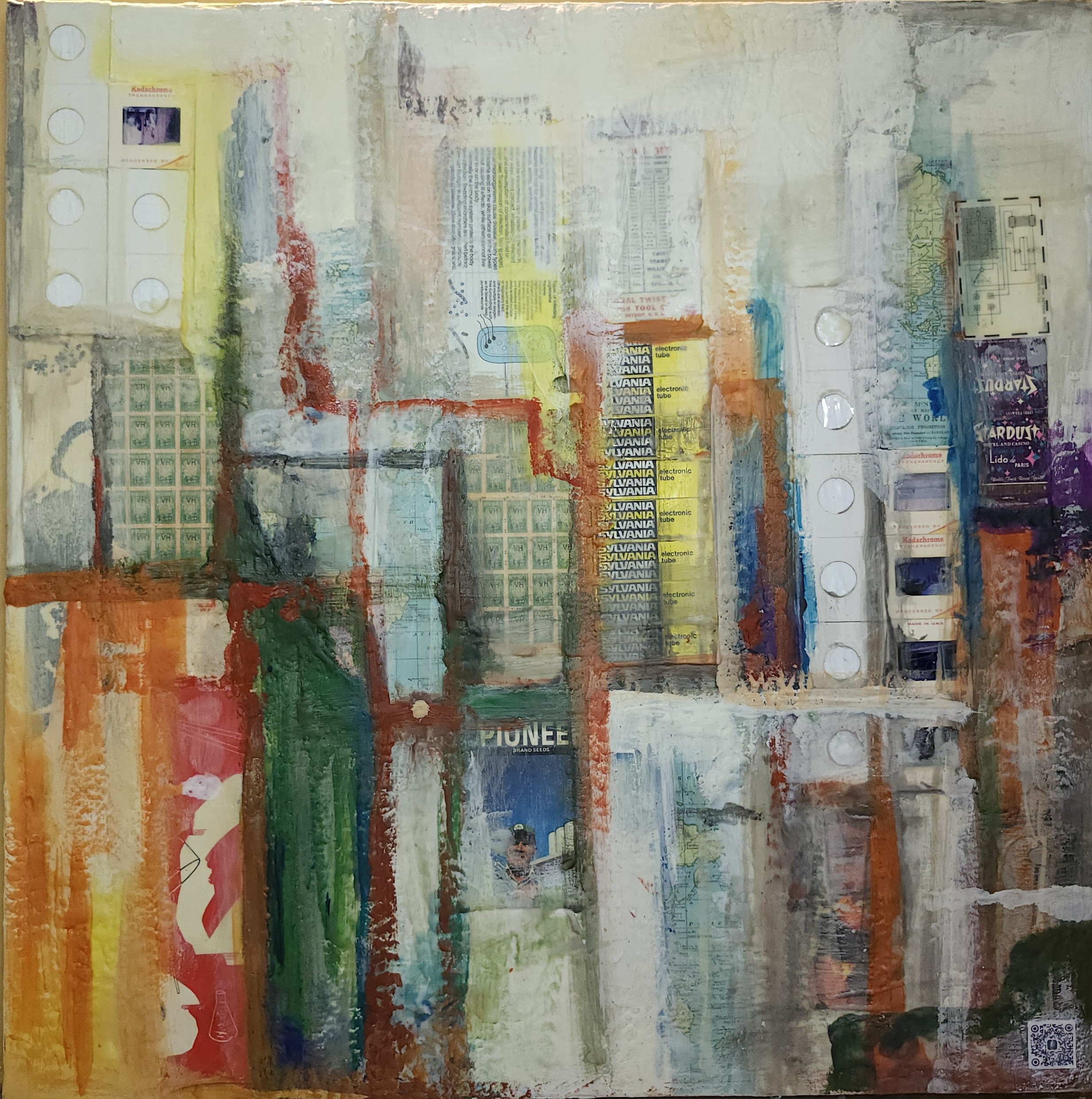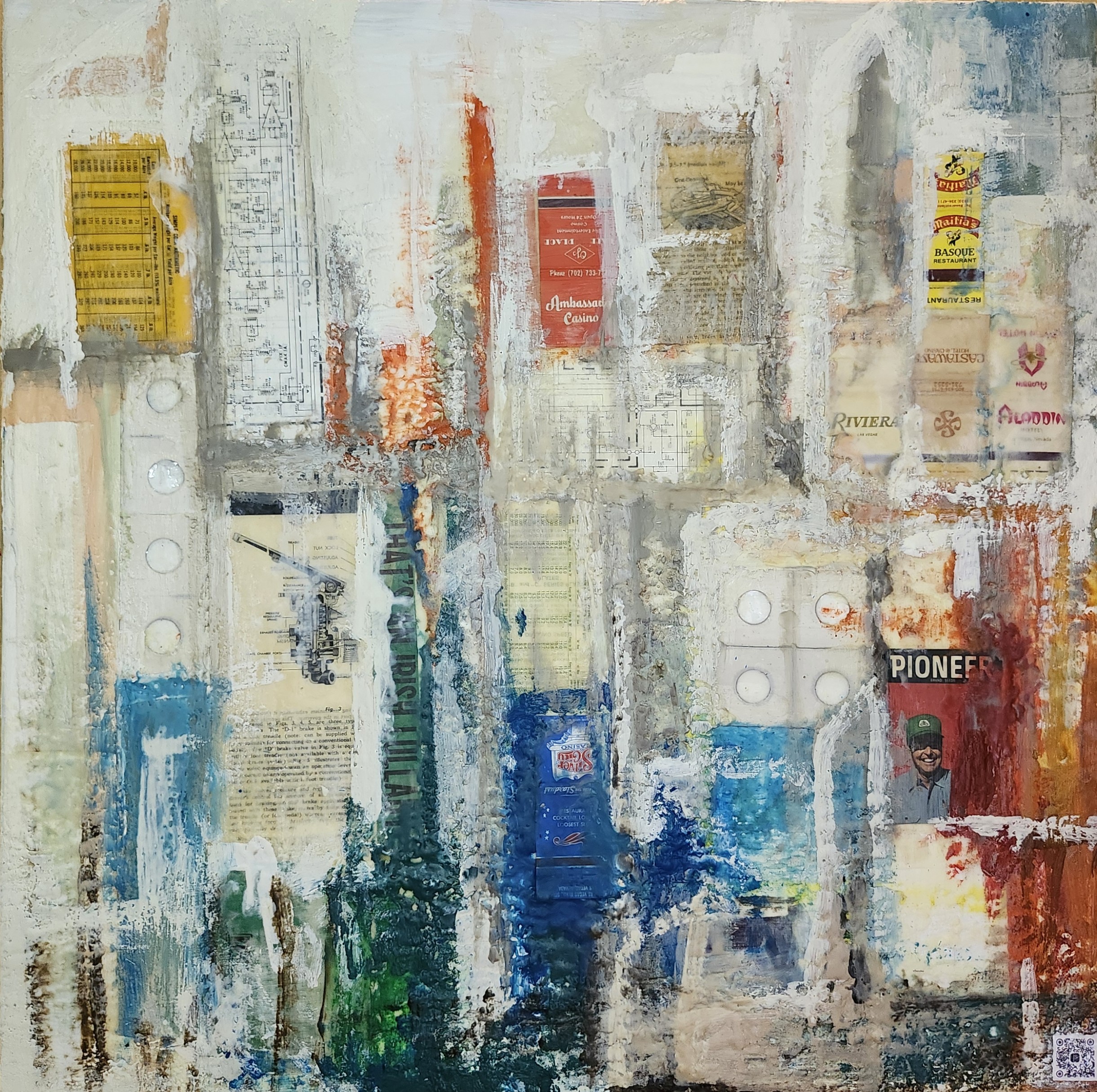 I love creating rich texture and tones with wax, oil paint and layers of printed or metal materials. The repurposing of old wax, paper, metal including my old lithographs allow me to build rich layers of colour, texture and graphic juxtapositions. My current body of work depicts our constant evolution as a culture. Through the heavy textures and unique vintage elements, I look to communicate the many layers of history we are connected to through the universal energy we feel in cities around the world.